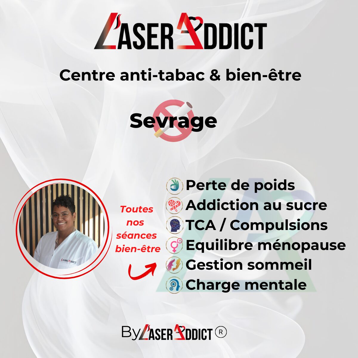 Formée à la technique au laser et au coaching avec la méthode LaserAddict, nous sommes à votre écoute pour vous accompagner dans le sevrage tabagique ou au cannabis. Nous vous accompagnons également dans votre perte de poids, vos troubles liés à la gestion du sommeil, à la charge mentale et à l’équilibre ménopause. Si vous avez une addiction au sucre, nous sommes là pour vous aider ! Nous vous recevons tous les jours dans notre centre LaserAddict à Besançon. Au plaisir de vous rencontrer !