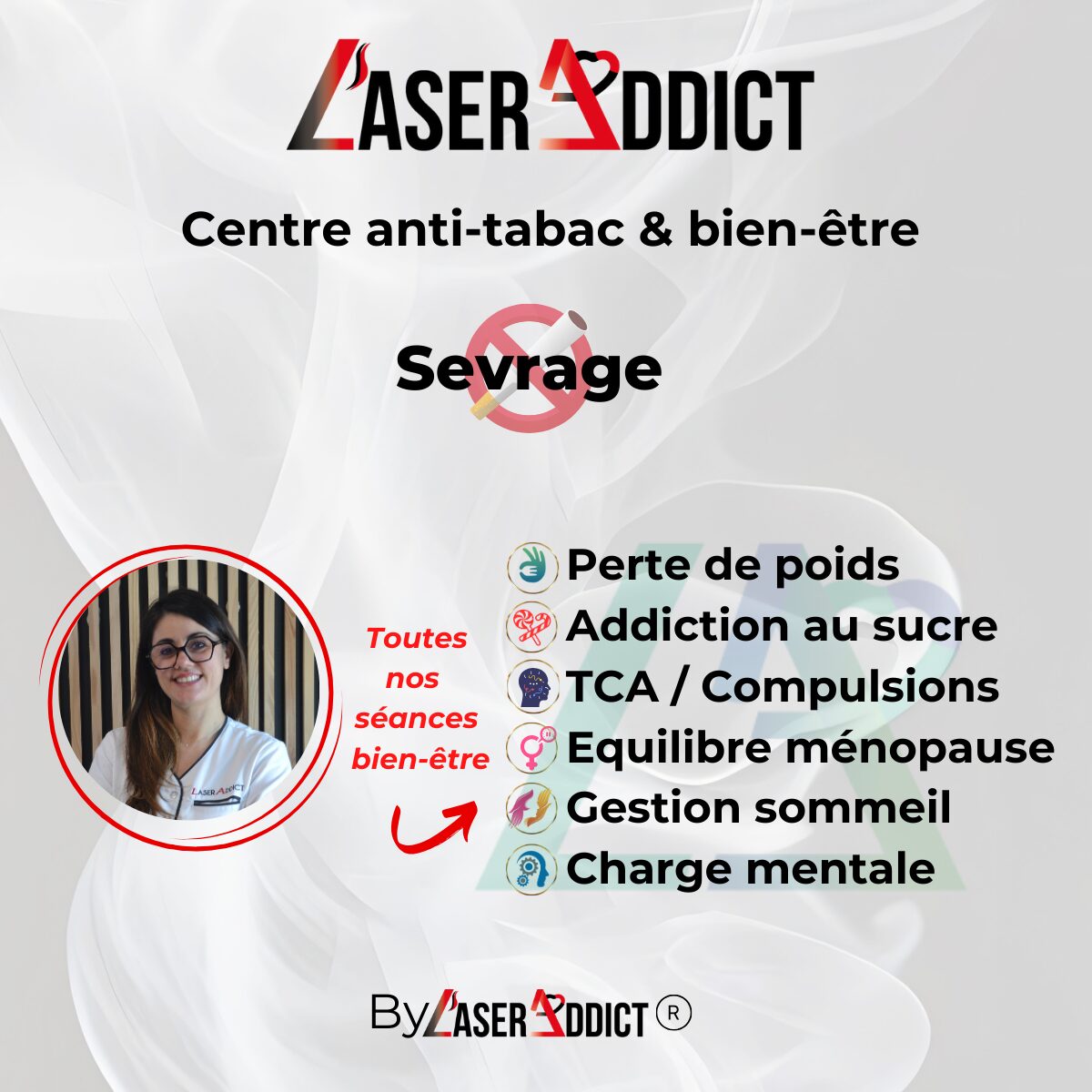 Formée à la technique au laser et de coaching avec la méthode LaserAddict je suis à votre écoute pour vous accompagner dans le sevrage tabagique ou cannabis ! Je vous accompagne également dans votre perte de poids, vos troubles liés à la gestion du sommeil, à la charge mentale et à l’équilibre ménopause. Si vous avez une addiction au sucre je suis là pour vous aider ! Je vous reçois tous les jours dans mon centre LaserAddict ! Au plaisir de vous recevoir à Venelles.