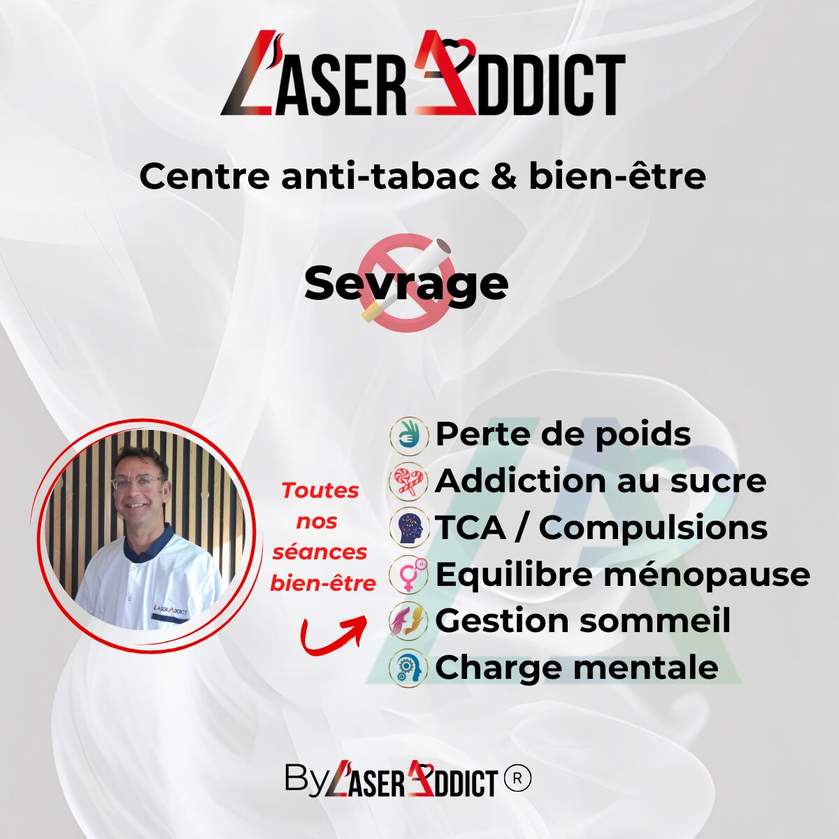 Formé à la technique au laser et au coaching avec la méthode LaserAddict, nous sommes à votre écoute pour vous accompagner dans le sevrage tabagique ou au cannabis. Nous vous accompagnons également dans votre perte de poids, vos troubles liés à la gestion du sommeil, à la charge mentale et à l’équilibre ménopause. Si vous avez une addiction au sucre, nous sommes là pour vous aider ! Nous vous recevons tous les jours dans notre centre LaserAddict à Nîmes. Au plaisir de vous rencontrer !
